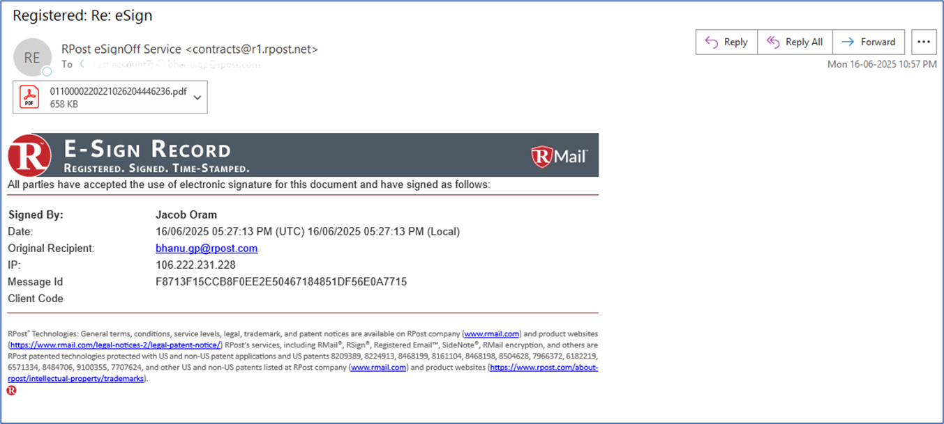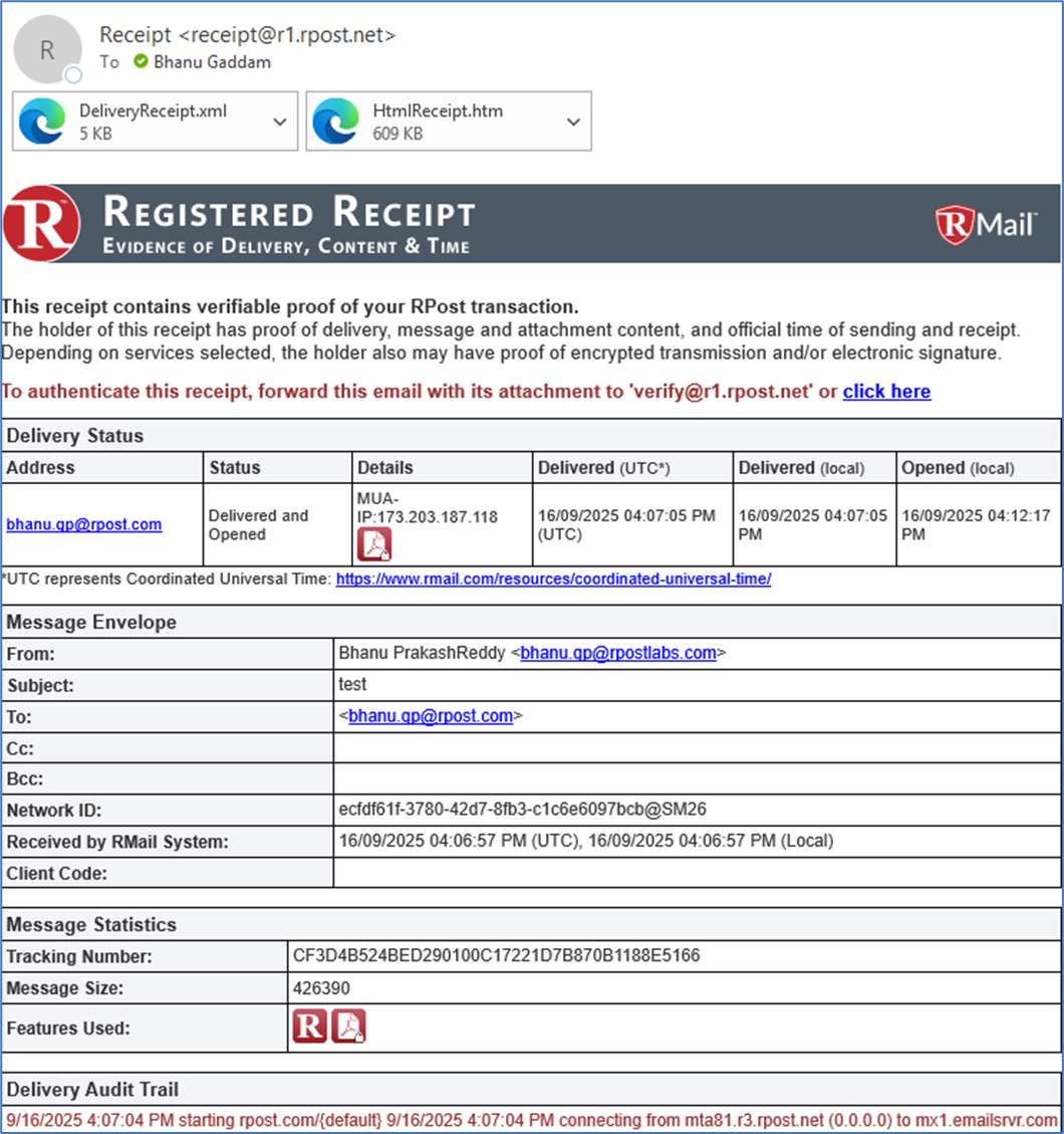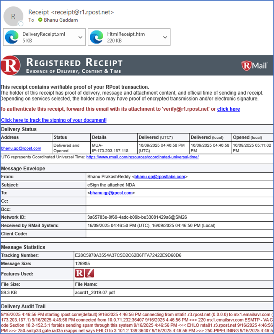 8. The sender will receive a Registered Receipt™ email record, providing court-admissible proof of delivery, content, and timestamps.