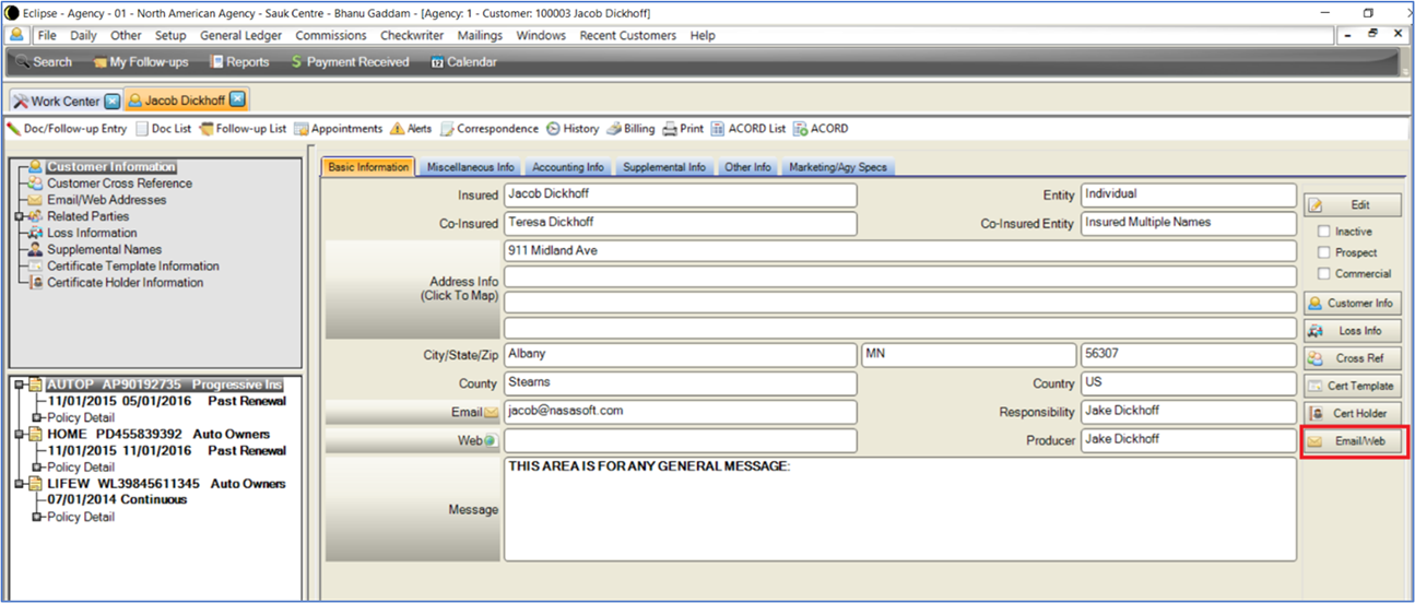 1. Log in to the Eclipse by NasaSoft platform, access a customer, and click on the Email/Web button.