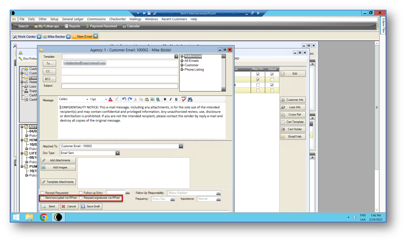 RMail® service integration with Eclipse allows NasaSoft Eclipse users to send signature requests and encrypted registered emails right from within the Eclipse platform for safe and secure sending of sensitive data digitally. Eclipse users can quickly and easily convert underwriting submissions, re-classifications, delinquent premiums, policy packs, coverage/endorsement rider changes, and renewals, making them PII and HIPAA compliant, as well as cutting costs associated with postage, courier, and administrative tasks.