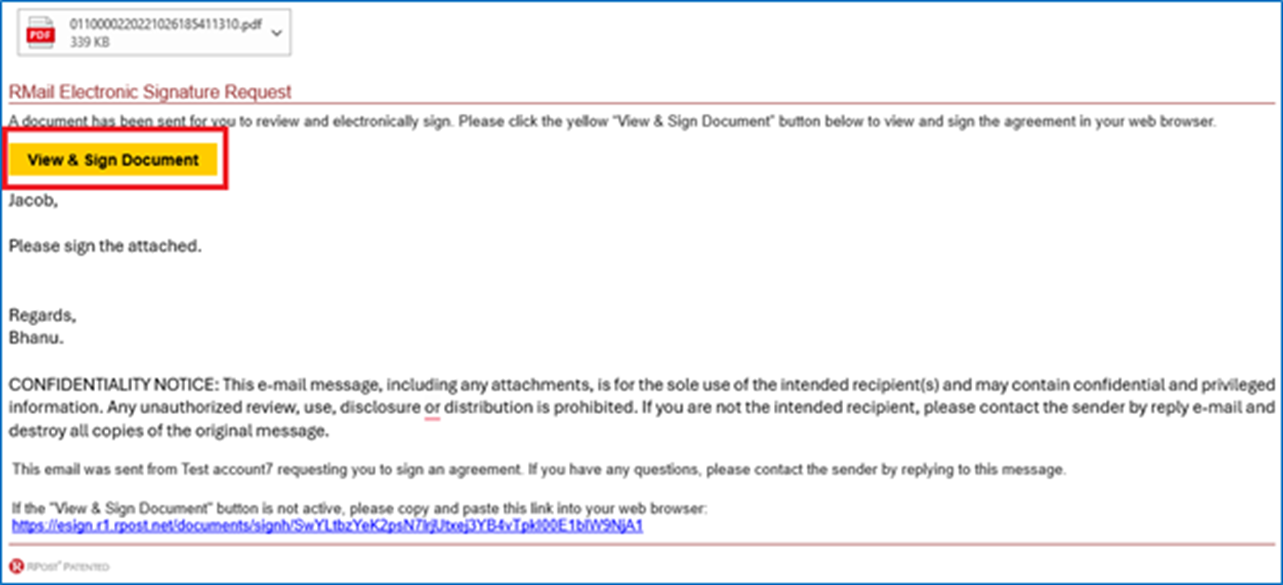 6. An RMail® Electronic Signature Request email is sent to the recipient.