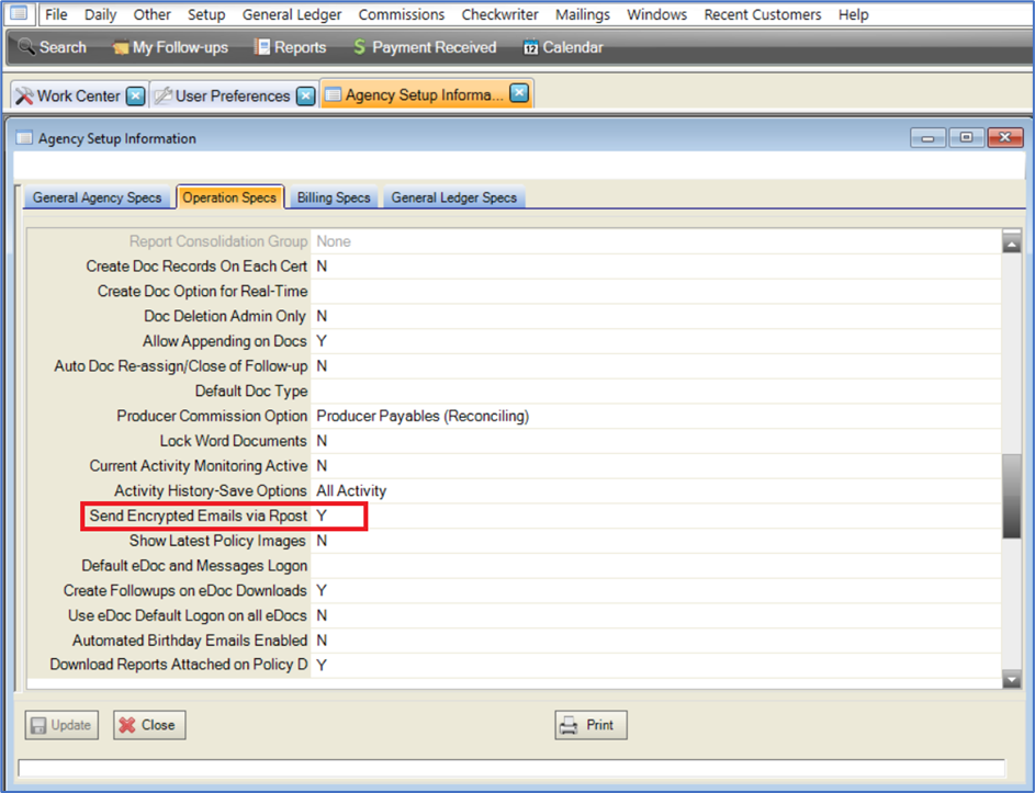 1. To enable the RMail® for Eclipse integration, navigate to Setup>Agency Specifications>Operation Specs.