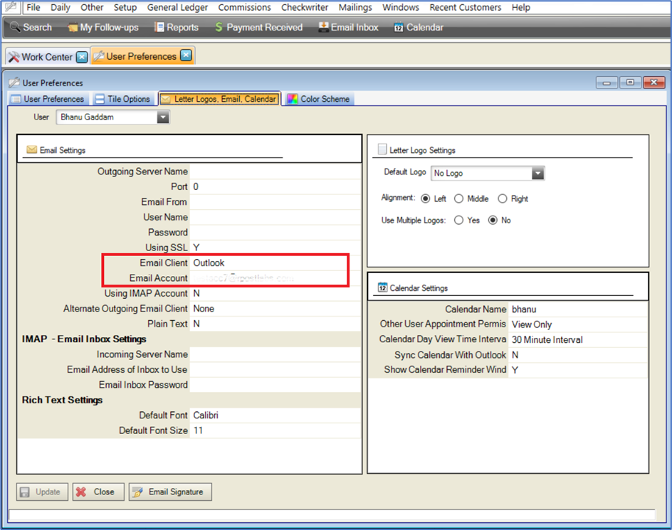 4. Configure the Email Client for the Eclipse login user in Eclipse going to User Preferences>Letter Logos, Email, Calendar>Email Settings and save it.
