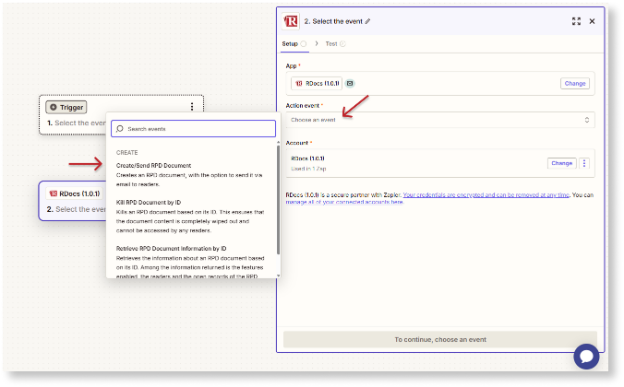 Choose a Trigger to start your Zap, and then click on the Action to set up RDocs for the action step: